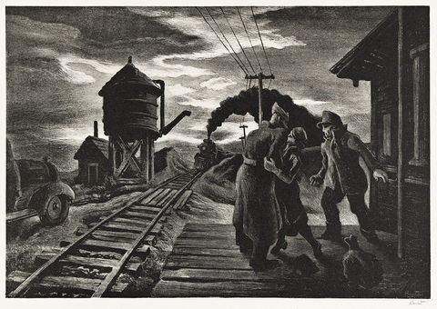 The images created by Thomas Hart Benton are often ranked second only to those of Norman Rockwell in capturing the American spirit in the mid- 20th century. This work, entitled “Morning Train”, created in 1943, shows a train approaching a small stop somewhere in the Midwest. More importantly, it is showing the parents are saying goodbye to their son who is about to go off to fight in World War II. Thomas Hart Benton captures the emotional scene with the young man hugging his mother, while his father stands stoically apart. This scene resonated profoundly with millions of American families, as the United States was ramping up to unleash its industrial and military might during World War II. This work was issued in a print run of 250; each copy was signed by Benton himself. This artwork was acquired at an auction of prints at Swann Galleries in October 2024.