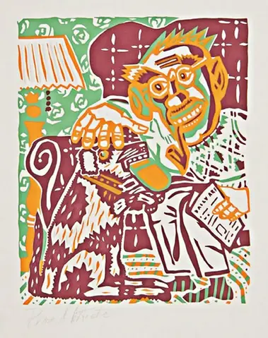 Red Grooms is one of the great art pranksters of our time. In this case, he created an image in which a newspaper is written for dogs, hence the artwork’s title: “The Daily Arf” In the image, the dog panting as if to see more news in The Daily Arf, while his best friend (man) is scratching its head. This particular work is an AP (Artist’s Proof), numbering 10 of 12 total, signed and dated. It was created in 1974. The Daily Arf was acquired by The Martin Art Trust in June 2025, through an offering on First Dibs, the on-line cyber tag sale focused on fine art and other collectibles.