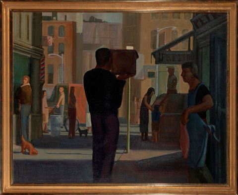 A friend who helped me put this massive oil painting on a wall in my apartment, studied the artwork, entitled “Friday Deliveries”, and observed that the work had to be made after 1980. “Why?” I asked. “Because the city only installed the street lamps visible in the painting after 1980,” he replied. As I looked at the painting, which measures just over 40” x 50”, I noticed that the artist has taken care to include other wonderful clues to one thing that was missing: No cell phones were to be seen! That means that this painting, completed in 1983, is a time capsule based on the artist’s keen observation. It would be several years before everyone would have a cell phone glued to their ears! The Martin Art Trust acquired this work at Doyle Fine Art in February 2025. But bringing the painting home meant calling on my cell phone to get a large Uber to transport it! As I pondered how I ever lived without high tech services, I muttered to myself: “God bless technology!”