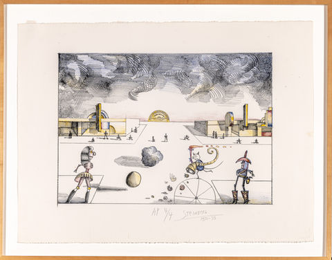 One of the leading illustrators and cartoonists for over 50 years, until his death in 1999, Saul Steinberg was noted for his quirky take on various aspects of daily life, as well as whimsical cityscapes of which the work shown here is an outstanding example. Entitled “Main Street”, this color lithograph, is a rare Artist’s Proof (AP) of which only 4 such copies were produced. The work, created in 1972-73, was acquired by The Martin Art Trust in an auction sale at Doyle Fine Art in early 2025.